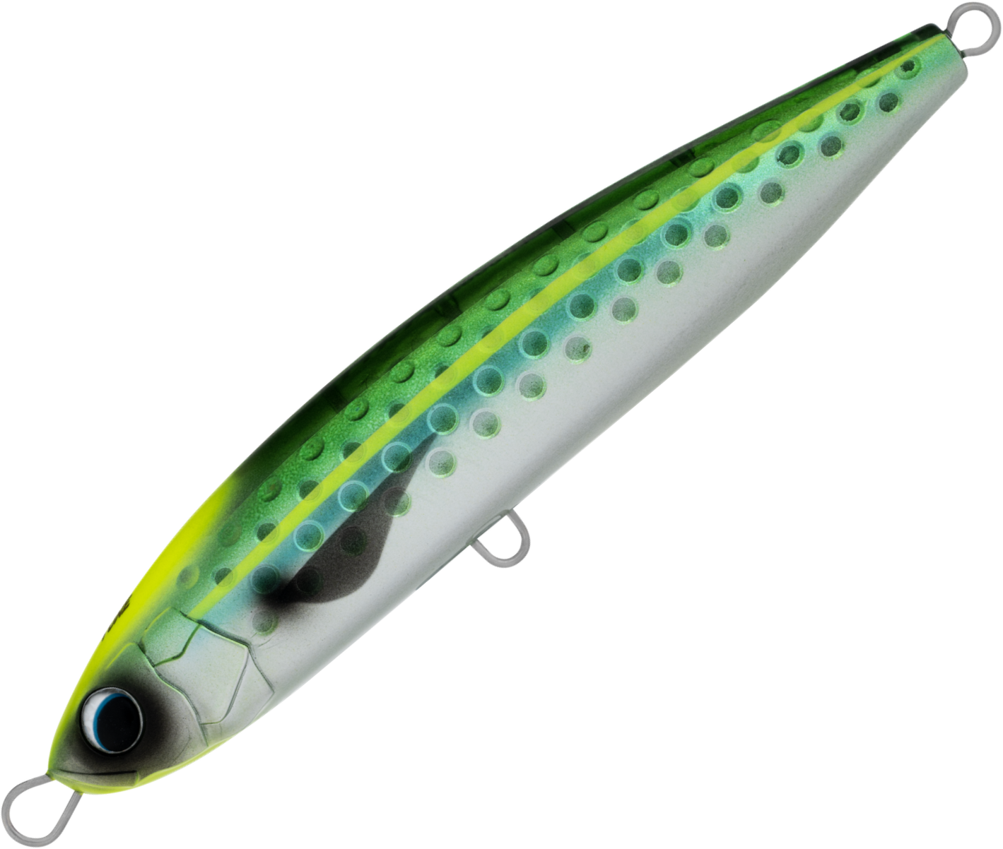 The Saltiga Rough Ride construction is unique, with first glance immediately noticing the dimpled pattern like a golf ball. This pattern stabilizes the lure both in the cast through the air, and when retrieving through the water. The dimples create a stable pocket of air hugging the lure’s body, preventing tumbling, and aiding in swimming stability in rough water conditions.