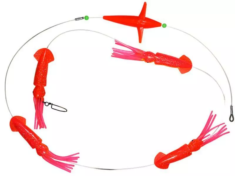 The Pakula No Brainer Brad J Daisy Chain is made up of a 5” 13cm Lumo Orange Bird, 4 x 7” 18cm Lumo Brad J (Lumo Orange / Lumo Pink) Squids, 6.5’ – 137m of 300lb leader and a size 7 ball bearing snap swivel. The Bird and Squid have Cat, UV2 and Lumo additives. At this stage we are only doing the one colour. Due to the results, we think it’s all we need to make.